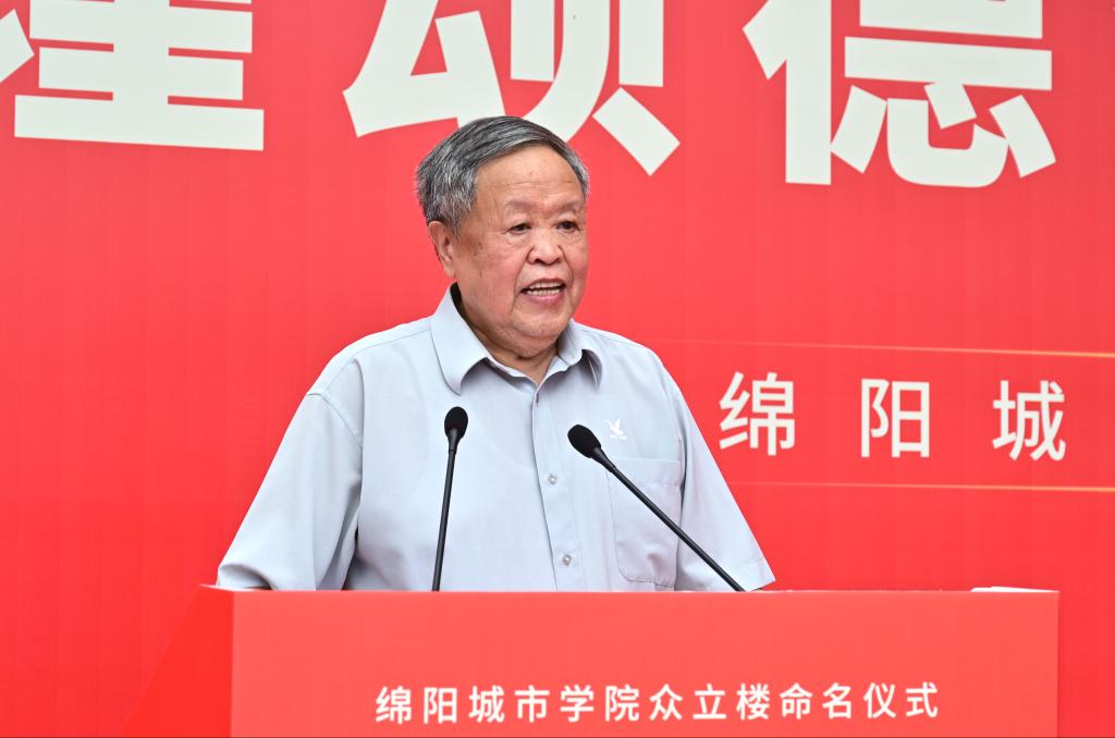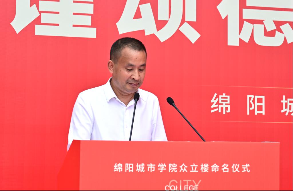 仪式在庄重而热烈的氛围中拉开帷幕,副理事长、学校副校长左申兵代表理事会致辞。他深情回顾了李众立校长在学校发展的关键时期临危受命,执掌学校十一年的卓越贡献。他在致辞中指出,众立校长以赤子之心、雄健伟力和育人情怀,带领学校实现了从生存之忧到万人规模、从通过学士学位评估到开启双校区新纪元的历史性跨越,并为学校奠定了“校企融合”的办学特色和“能干、有用”的育人准则。他强调,“众立楼”的命名不仅是对老校长峥嵘岁月的铭记,更是将其开拓、奉献的精神永久植入学校的发展基因。他号召全体师生传承这份宝贵财富,将其转化为推动学校高质量发展的不竭动力,共同谱写绵阳城市学院新的辉煌篇章。