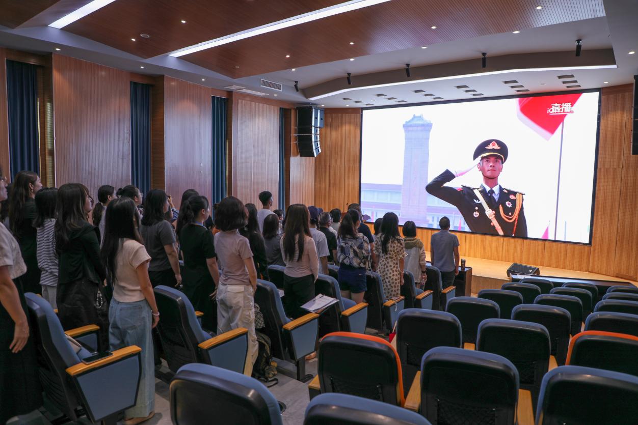 上午9时,随着庄严的国歌奏响,全体师生自发起立,目光肃穆地注视着荧幕中的五星红旗,现场氛围庄重而热烈。当现代化武器装备驶过天安门广场,当受阅官兵以昂扬姿态展现新时代军人风貌时,现场惊叹声与自豪感交织,不少师生拿出手机记录下这一振奋人心的画面。