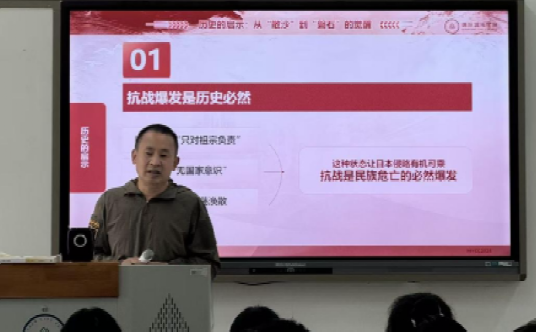 副校长左申兵副教授以抗日战争胜利80周年为切入点,通过抗战爆发是偶然还是必然、中国共产党为何是中流砥柱、纪念胜利的意义何在三个核心问题,带领学生回顾了从“一盘散沙”到“众志成城”的民族觉醒历程。左校长的讲解结合历史史料与现实案例,让学生深刻理解了国防的历史厚度与时代重量。
