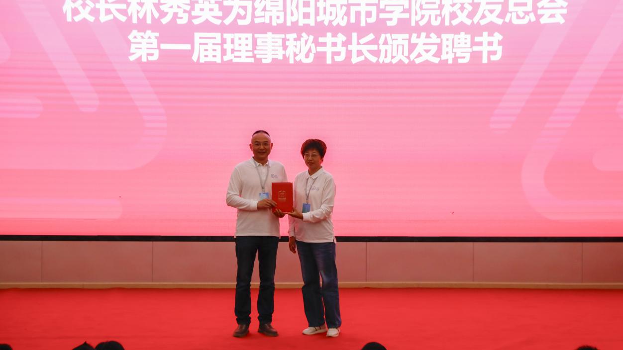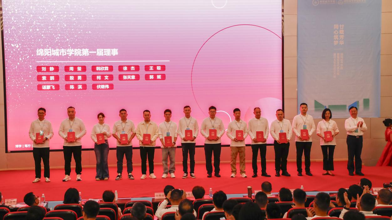 校领导共同为"绵阳城市学院校友总会"揭牌并为校友会秘书长、理事颁发聘书,标志着校友工作进入规范化发展阶段。