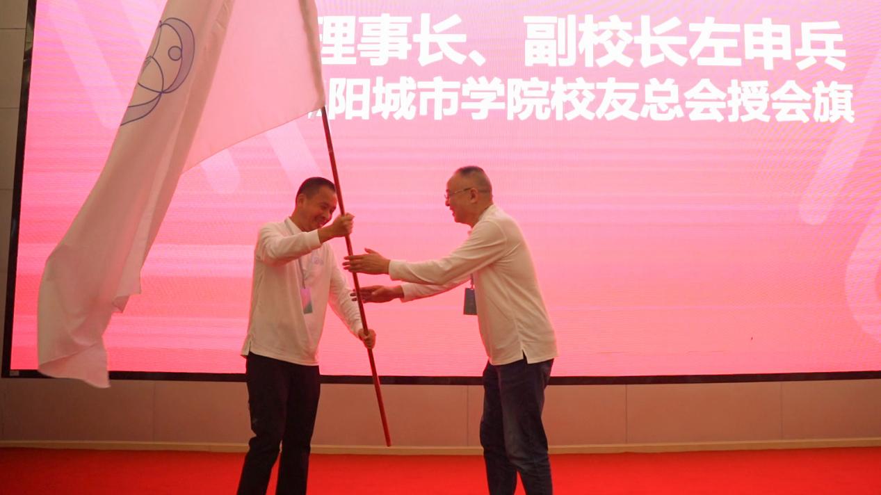 在授牌仪式环节,校党委书记王俊佳为校友总会会长、副会长颁发聘书,副校长左申兵向校友总会授旗,象征着校友工作的正式启航。