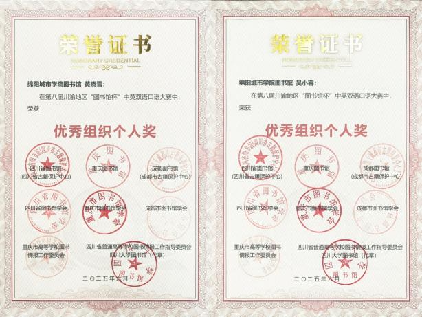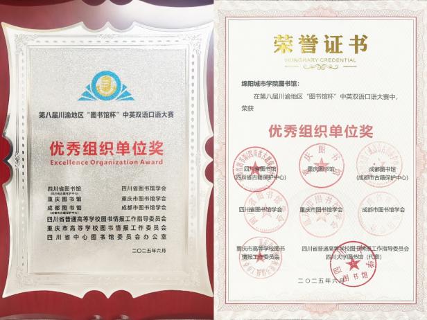 近日,第八届川渝地区“图书馆杯”中英双语口语大赛在遂宁市图书馆落下帷幕。我校图书馆在本届赛事中荣获“优秀组织单位奖”,两位教师获“优秀组织个人奖”,两名同学获“读者组优秀奖”。