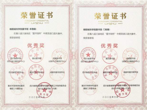 作为学校人才培养与文化建设的重要参与方,我校图书馆高度重视此次赛事,前期积极开展选手选拔、赛前指导等组织工作,联合二级学院为参赛师生提供专业支持。比赛中,来自现代服务学院的牟橹璇与现代技术学院的门锐敏两名同学凭借扎实的中英双语表达能力以及对“巴风蜀韵,世界双城”主题的深刻理解,在众多选手中脱颖而出,最终斩获“读者组优秀奖”;现代服务学院黄晓雪老师与图书馆吴小容老师因在赛事组织、师生动员等工作中表现突出,获评“优秀组织个人奖”;同时,我校图书馆由于整体组织工作高效有序,获“优秀组织单位奖”。