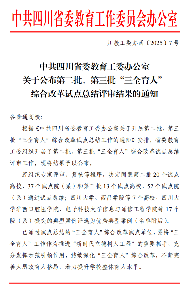 近日,中共四川省委教育工委办公室公布了第二批、第三批“三全育人”综合改革试点总结评审结果。我校作为第二批“三全育人”综合改革试点高校,顺利通过试点总结评审(验收)。《PDM系统助力“三全育人”的机制创新与实践成效》入选优秀典型案例(全省民办高校中唯一获此殊荣的单位)。